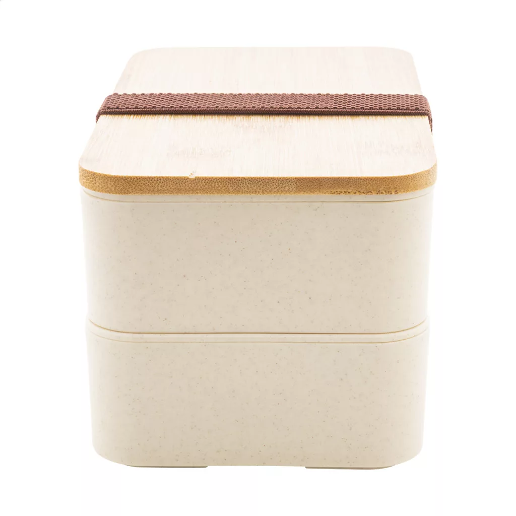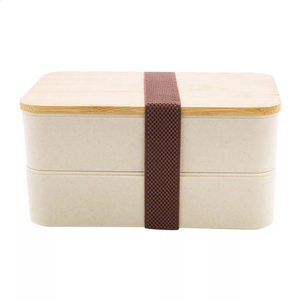 PP műanyag uzsonnás doboz evőeszköz készlettel (villa, kanál és kés), bambusz tetővel és rugalmas pánttal. 2 darab, egyenként 700 ml rekesszel.
