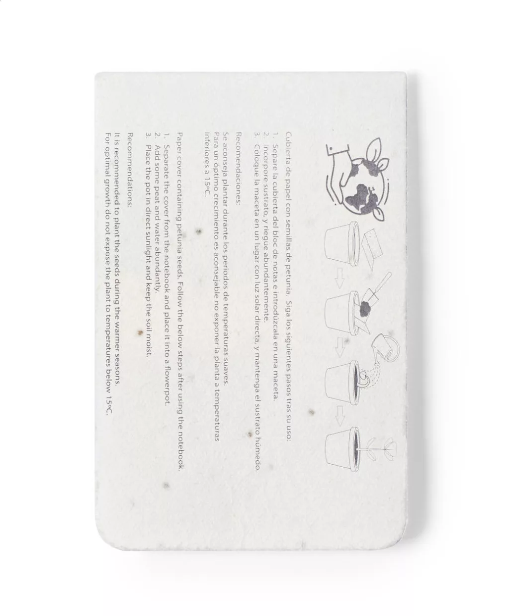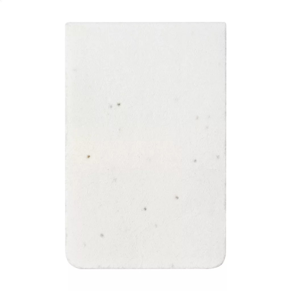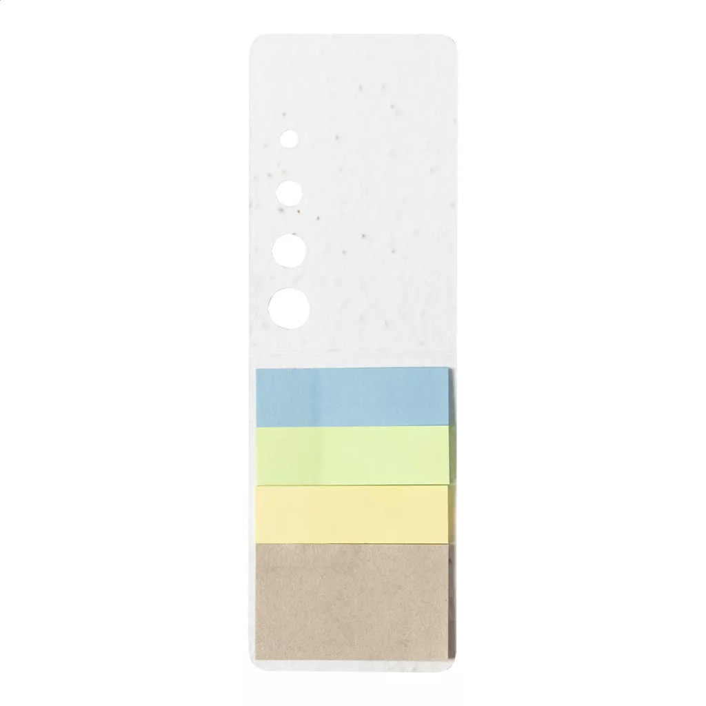 Újrahasznosított papírból készült öntapadós jegyzettömb magpapír borítóval, 10 lappal és 30 oldaljelölővel (3 különböző színben). A magpapír borító különböző vadvirág magokat tartalmaz, melyeket a borító és a füzet szétválasztása után lehet elültetni.