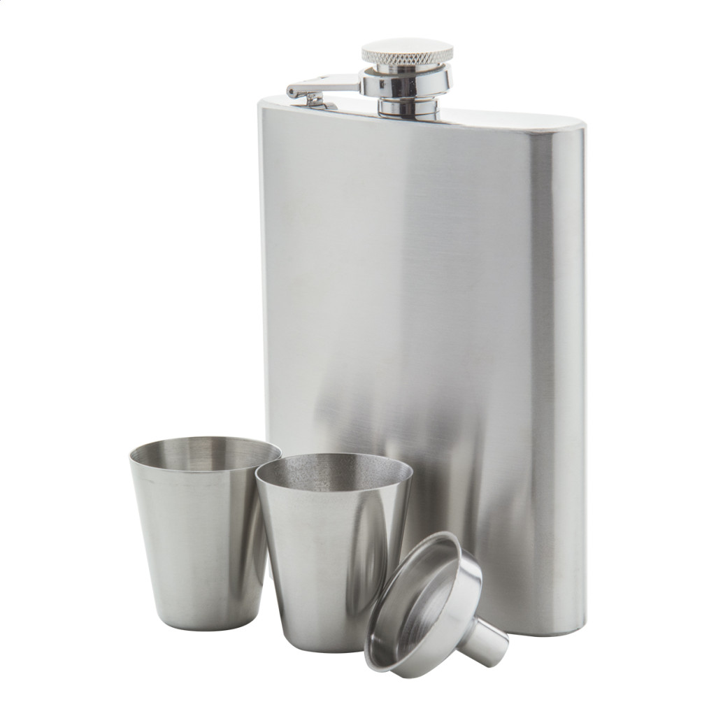 Rozsdamentes acél laposüveg szett tölcsérrel és 2 feles pohárral, 230 ml. Fekete díszdobozban szállítjuk.