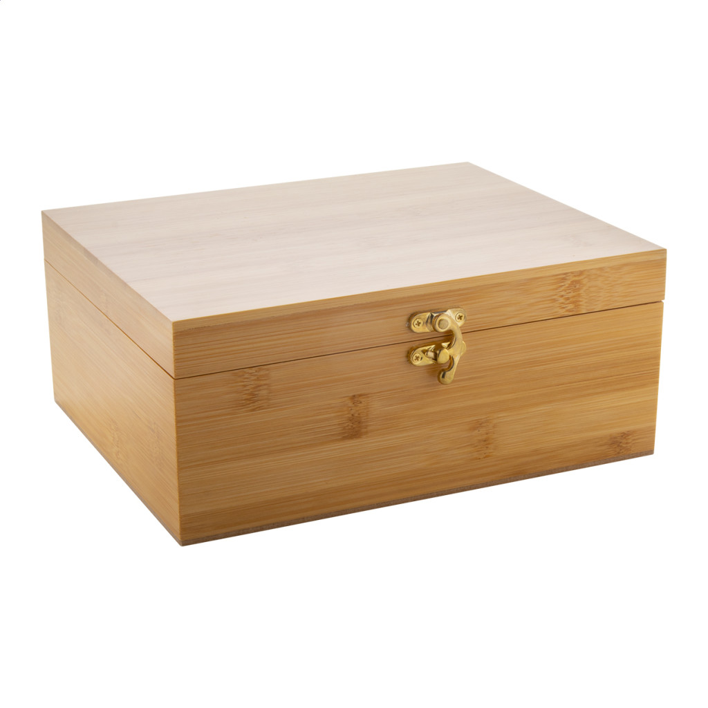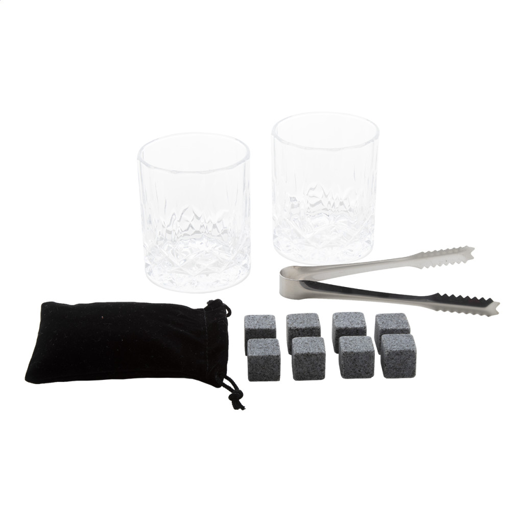 Luxus whisky szett bambusz dobozban. 2 üvegpoharat (250 ml), 8 újrahasználható kő jégkockát tasakban és egy rozsdamentes acél fogót tartalmaz.