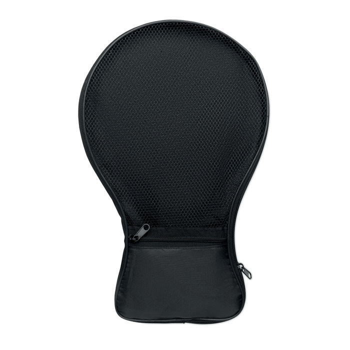 Strandjáték szett 2 rétegelt lemez ütővel, oldalukon sakk- és ''ki nevet a végén'' játéktáblával. Tartalmaz 1 TPR labdát, dobókockát és bábukat. RPET hálós cipzáras hordtáskában.