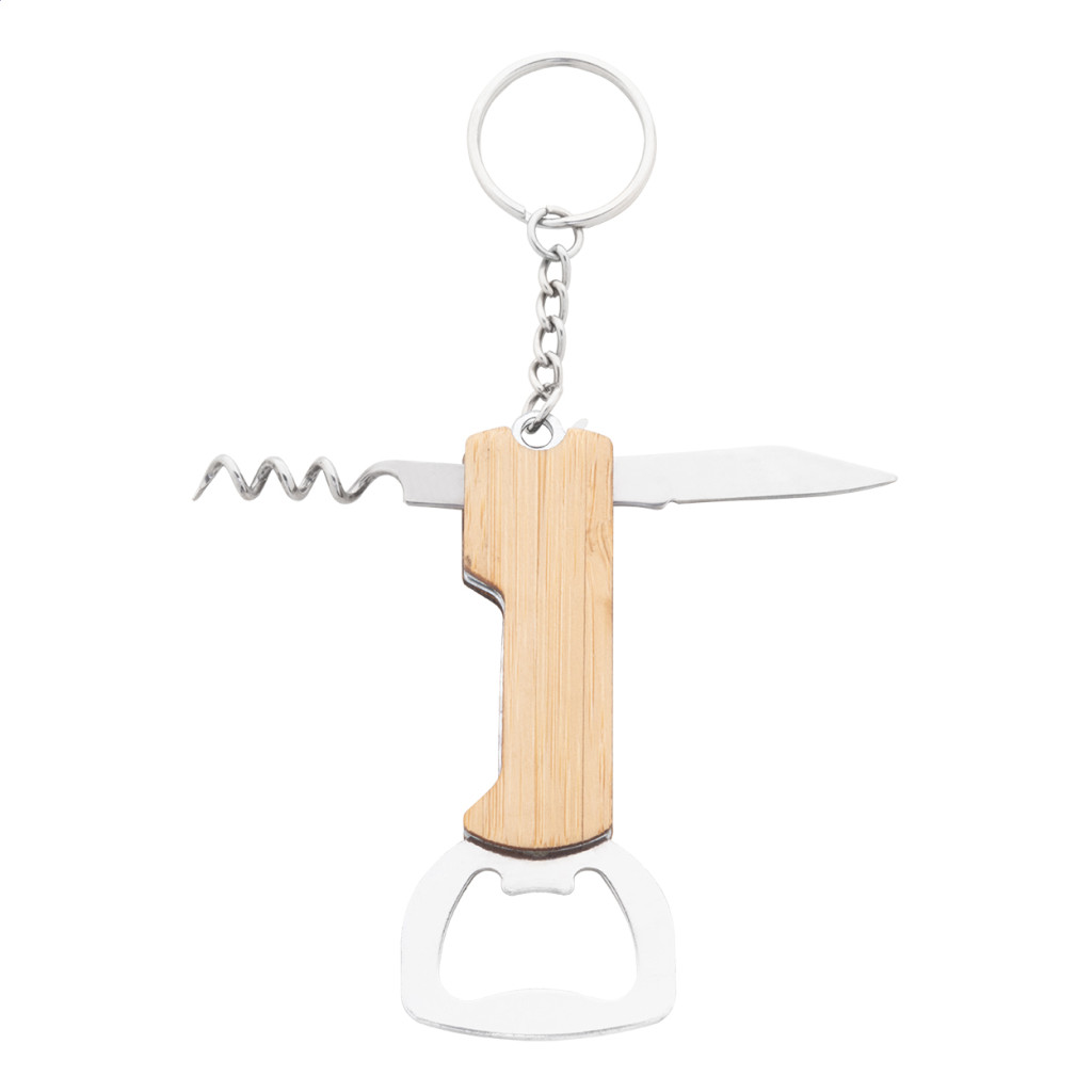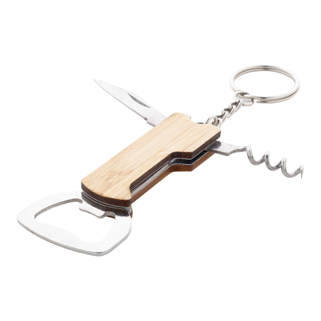 Bambusz és rozsdamentes acél üvegnyitós kulcstartó dugóhúzóval és zsebkéssel.