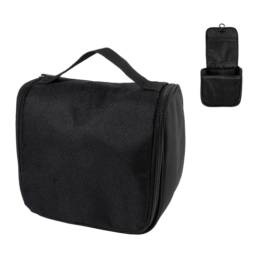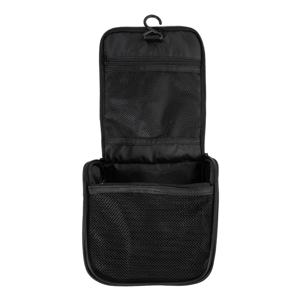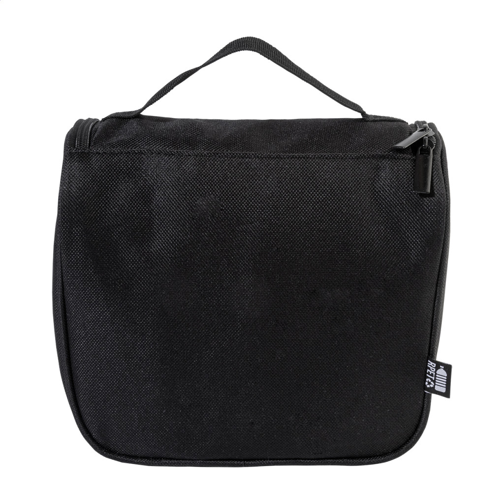 Akasztós RPET kozmetikai táska cipzáras belső rekeszekkel és hálós zsebekkel. 600D RPET poliészterből, megkülönböztető RPET címkével.