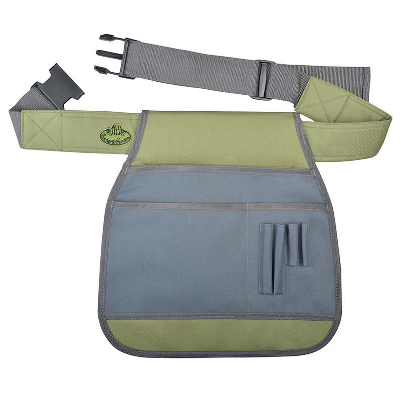 Kerti szerszámos övtáska, divatos zöld-szürke színben, hímzéssel. Nagy zsebeinek köszönhetően többféle szerszám tárolására is alkalmas, állítható övrészének köszönhetően saját méretünknek megfelelően beállíthatjuk. Kiváló ajándék ötlet a kertészet szerelmeseinek. Az övtáskát szerszámok nélkül szállítjuk.
