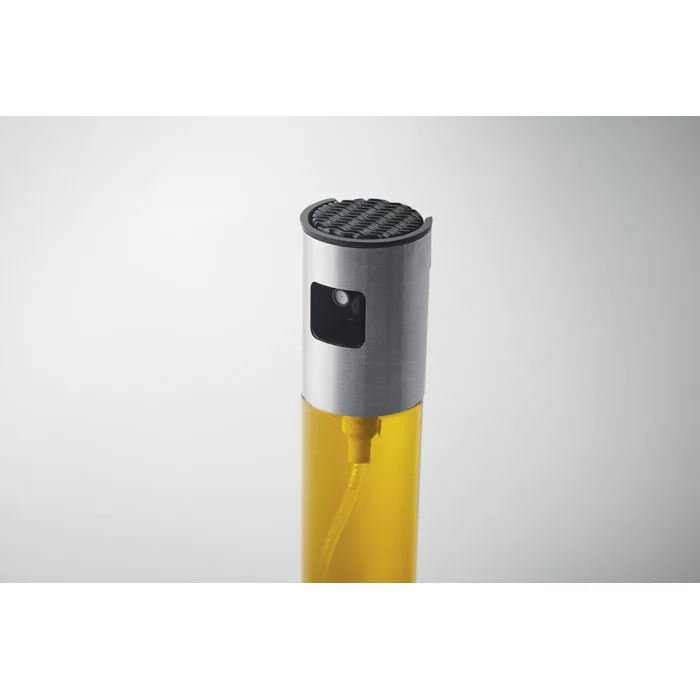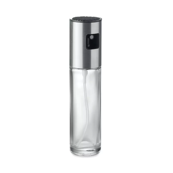 Üvegből készült olaj- vagy ételecet tartó rozsdamentes acél szórófejes adagolóval. Űrtartalom: 100 ml.