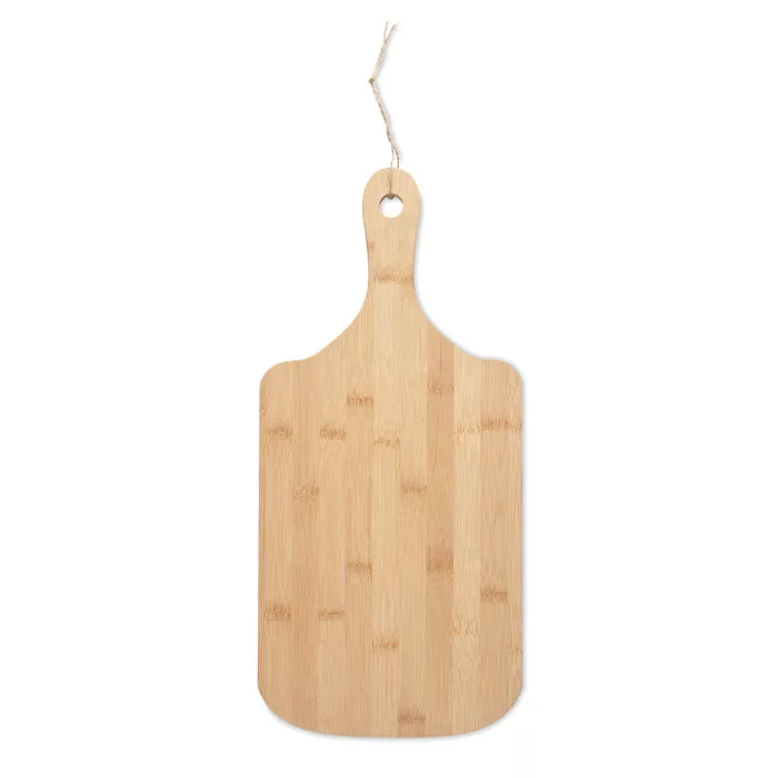 Természetes formájú tálalódeszka bambuszból, vájattal és juta kötéllel. A bambusz természetes anyag, színében, mintázatában és méretében esetenként eltérő lehet.