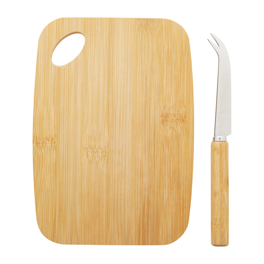 Bambusz sajtvágó készlet, rozsdamentes acél késsel és bambusz vágódeszkával. Kraft papír dobozban szállítjuk.