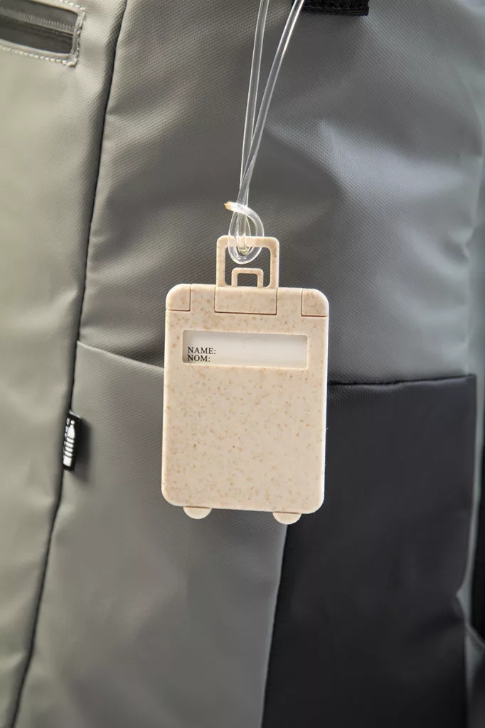 Gurulós bőrönd alakú, ökológiai búzaszalma műanyag bőröndcímke gumipánttal.