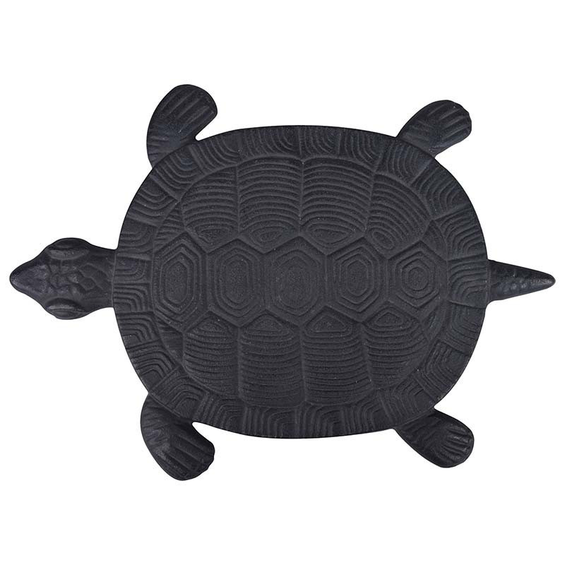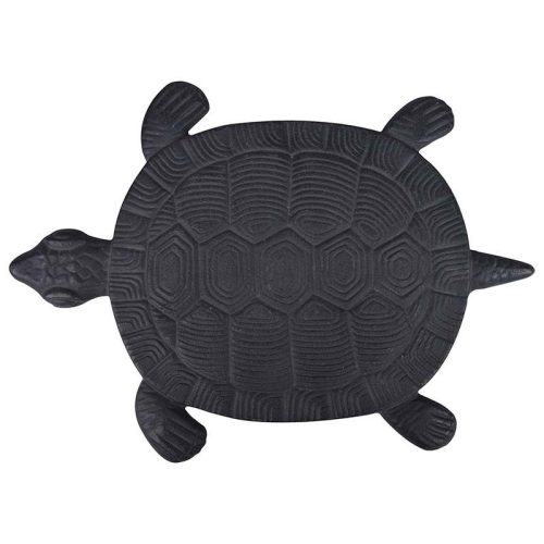 Öntöttvas, teknős alakú dekoratív lépőkő fekete színben. Engedjük el a fantáziánkat és alakítsunk ki látványos kis utakat lépőkövek segítségével. Mindegy, hogy a fűbe vagy a zúzott kőre rakva tesszük le őket, hiszen minden környezetben látványosan mutatnak. Öntöttvas jellegéből adódóan külső elhelyezés esetén, a korrózió megjelenésével egy patinásabb, rusztikusabb termék válik belőle.
