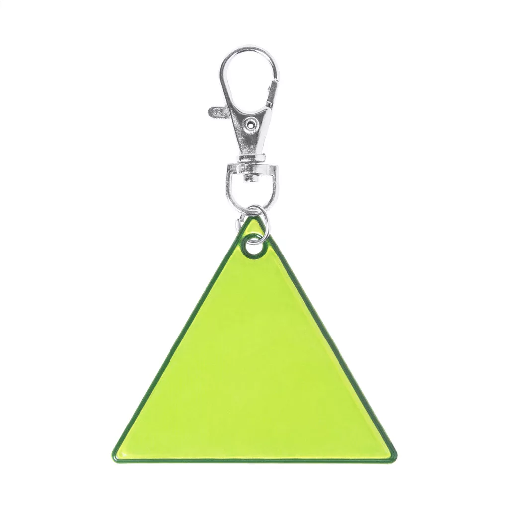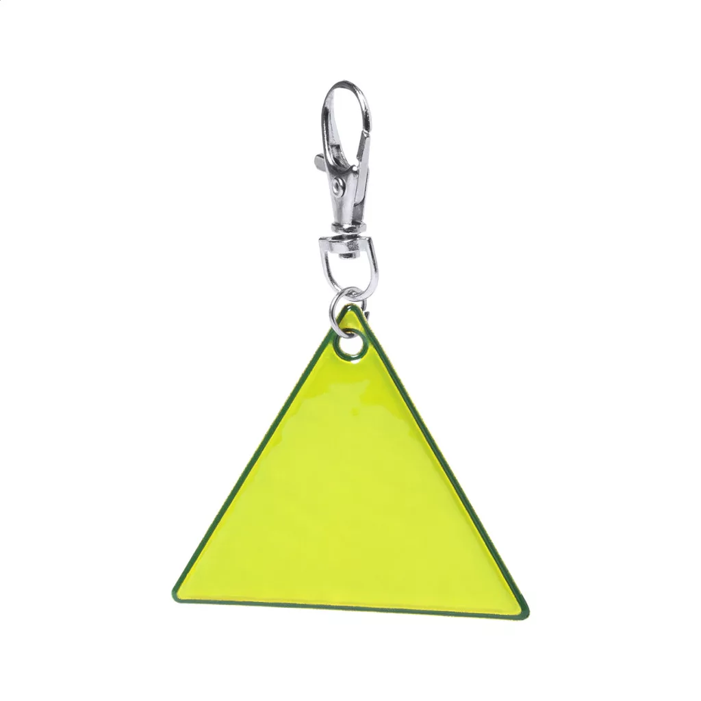 Háromszög alakú fényvisszaverő kulcstartó karabinerrel, PVC. A termék kizárólag promóciós célra alkalmas, nem minősül egyéni védőfelszerelésnek.