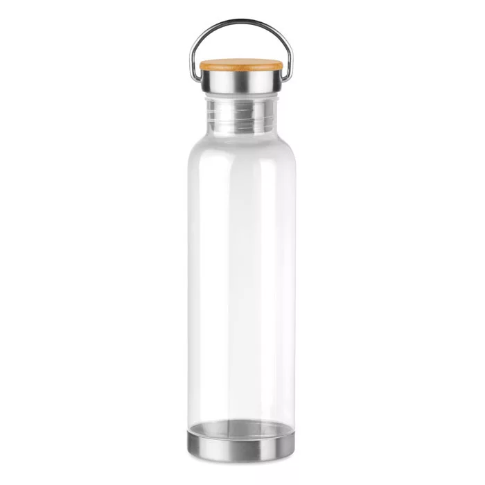 Tritán palack rozsdamentes acél aljjal és bambusz kupakkal. BPA-mentes. Űrtartalom 800 ml. A bambusz természetes anyag, színében, mintázatában és méretében esetenként eltérő lehet. Nem alkalmas szénsavas italokhoz. Szivárgásmentes.