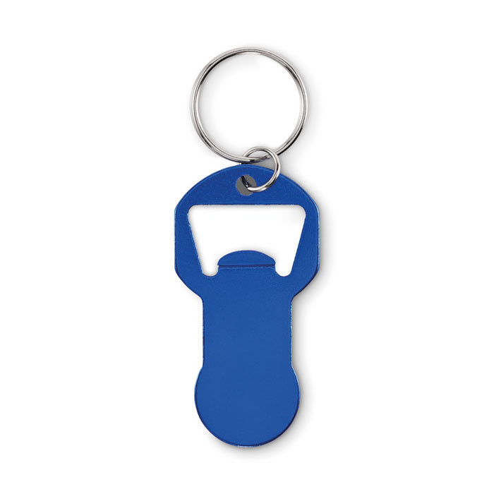 Újrahasznosított alumínium kulcstartó bevásárlókocsi-érmével, üvegnyitóval, vas kulcskarikával.