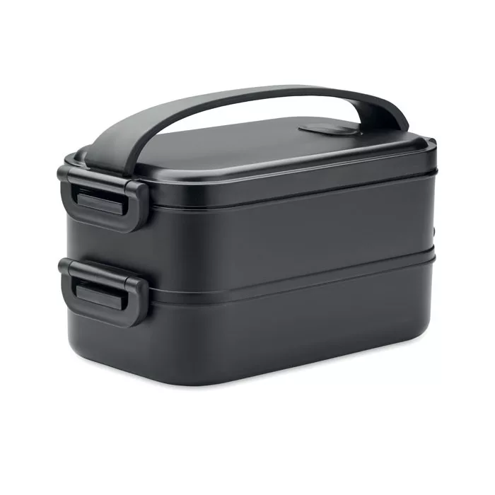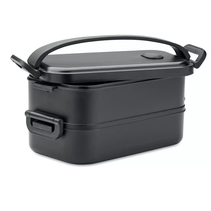 Újrahasznosított PP emeletes uzsonnásdoboz oldalsó zárócsatokkal, kivehető elválasztó résszel és légmentesen záródó fedéllel. Űrtartalom: 800 ml (2x).