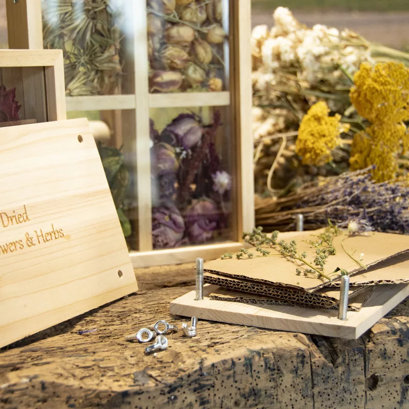 Lecsavarozható fából készült virág- és gyógynövényprés. Segítségével könnyen préselhetünk gyógynövényeket, virágokat. Száríthatunk levendulát, citromfüvet, különböző mentákat vagy kamillát és készíthetünk belőlük teát vagy házi szörpöt. Ideális préselt növénydíszek, faliképek és herbárium készítéshez. A növényprés két falapja négy csavarral egyszerűen összeszorítható, melynek köszönhetően akár több rétegben is elhelyezheted a növényeket. A növények közé helyezett kartonlapok elválasztják az egyes szinteket, és felszívják a levelekben, szirmokban található nedvességet. A két falap közé helyezett növények vastagságuktól függően 2 és 6 hét között szárad ki teljesen. Hasznos lehet óvodai, iskolai feladatokhoz, de segítségével profi herbáriumot is készíthetünk. A növényprés hasznos ajándék lehet természetkedvelő ismerőseidnek, de segítségével kreatív módon vezetheted be a gyerekeket is a természet világába.