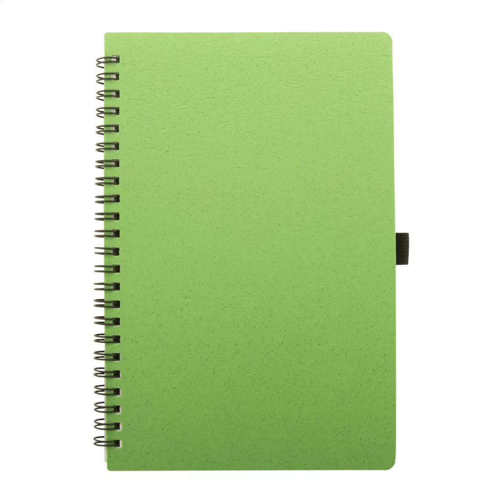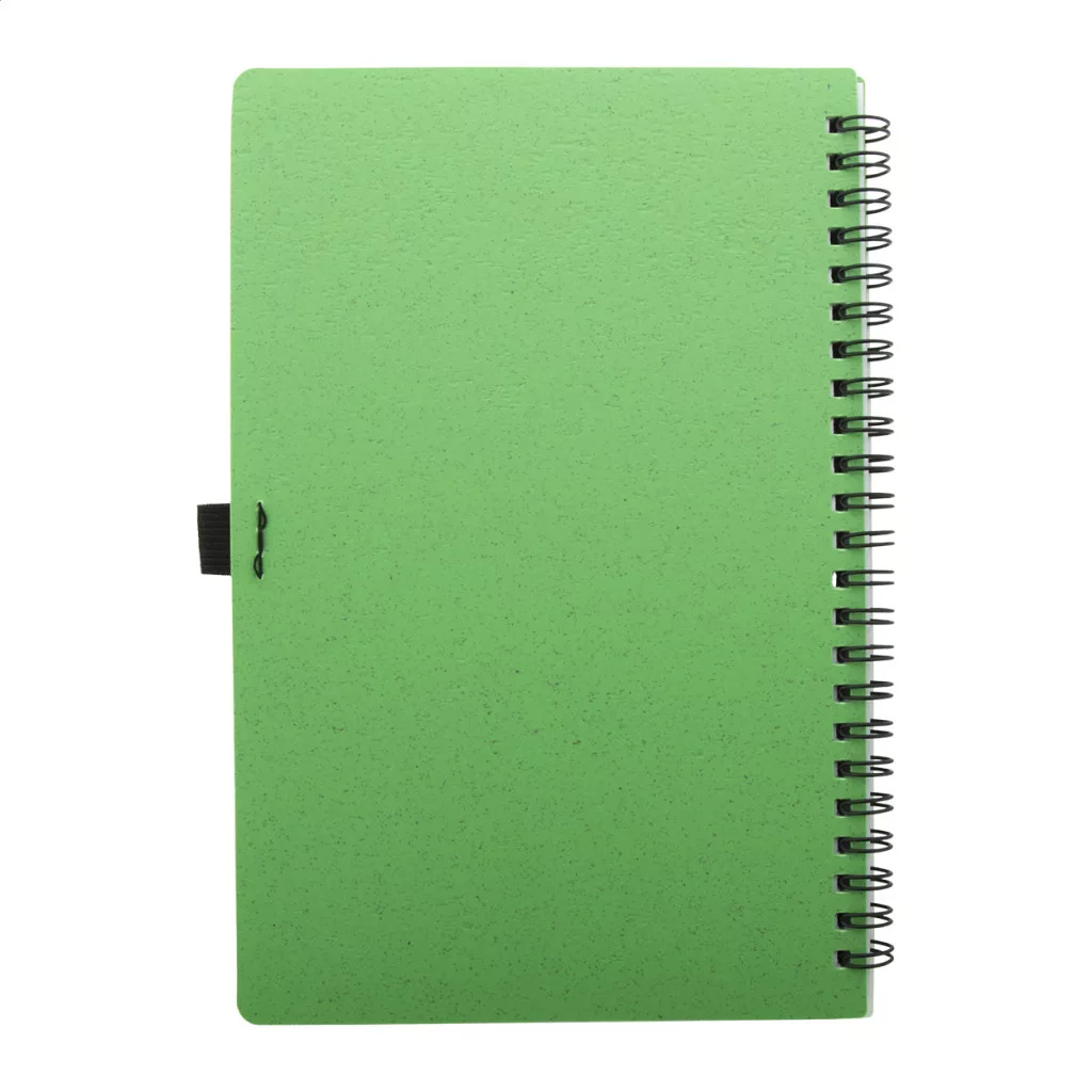 Ökológiai búzaszalma műanyag borítású spirál jegyzetfüzet újrahasznosított papírból készült 70 vonalas lappal és tolltartóval, A5 méret.