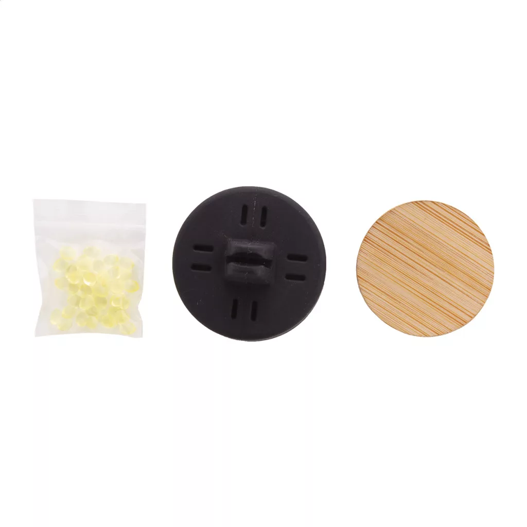 Szellőzőnyílásra rögzíthető, szilikon autóillatosító, bambusz előlappal és citromos illattal.