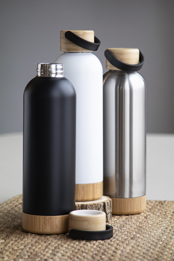 Rozsdamentes acélból készült duplafalú termosz, bambusz hordozható fedéllel és talppal, 500 ml.