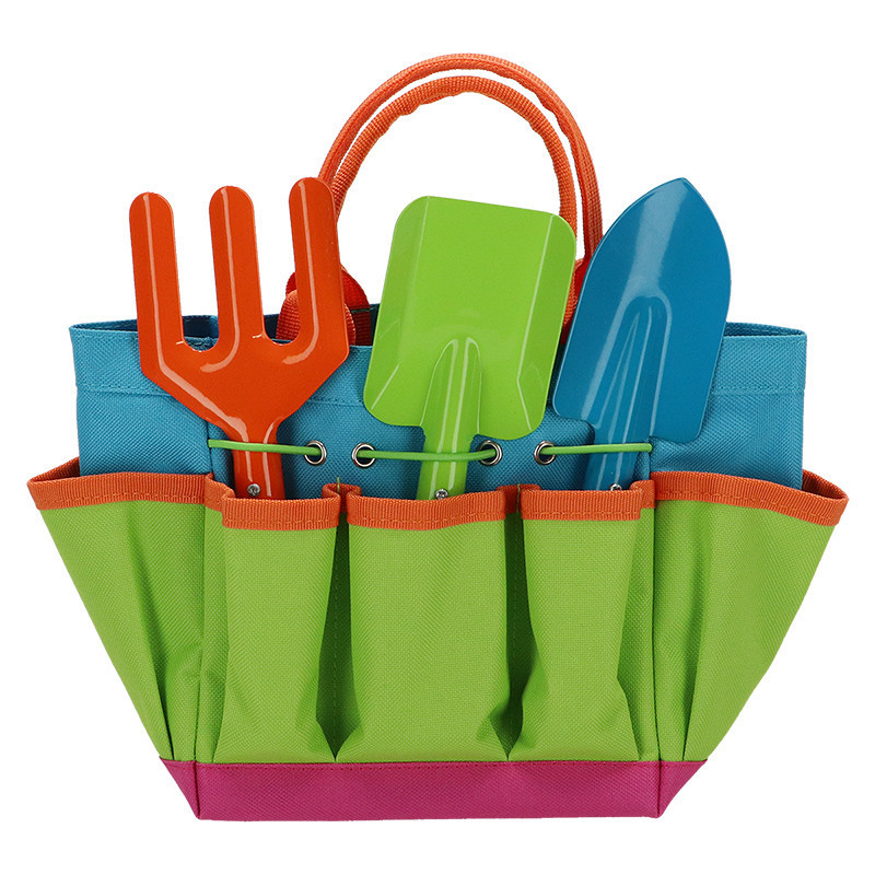 Fedezd fel ezt a praktikus táskát három kerti szerszámmal, amely segít a gyerekeknek a kertészkedésben. A szett tartalmaz egy lapátot, gereblyét és ásót, melyek kifejezetten kis kezekhez lettek tervezve. A táska több zsebbel rendelkezik, így helyet ad a magoknak, növénycímkéknek és egyéb kiegészítőknek.