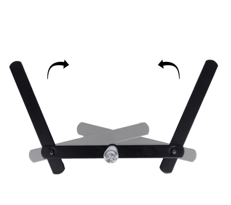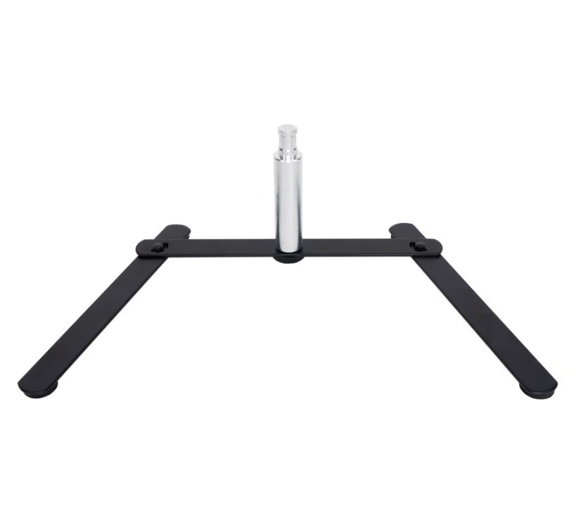 Asztalra tehető, összecsukható lábú, spigot fejes fém állvány.