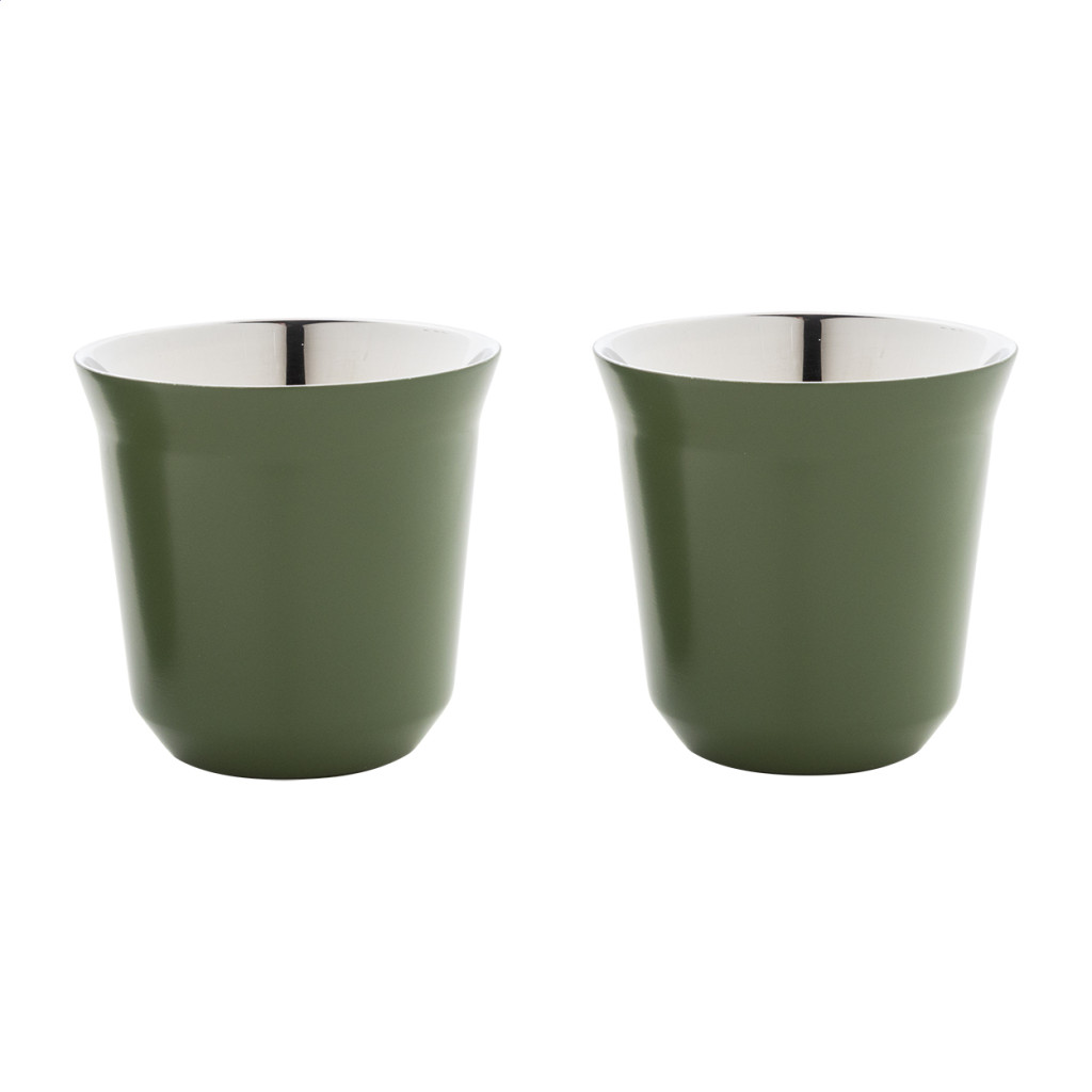 2 darabos eszpresszó csésze szett kávékapszula alakú, duplafalú, hőszigetelt thermo csészékkel, újrahasznosított rozsdamentes acélból, 80 ml. Kraft papír dobozban.