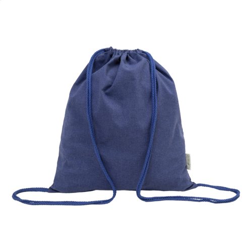70% újrahasznosított pamutból és 30% RPET poliészterből készült hátizsák, 140 g/m². Megkülönböztető újrahasznosított pamut címkével.