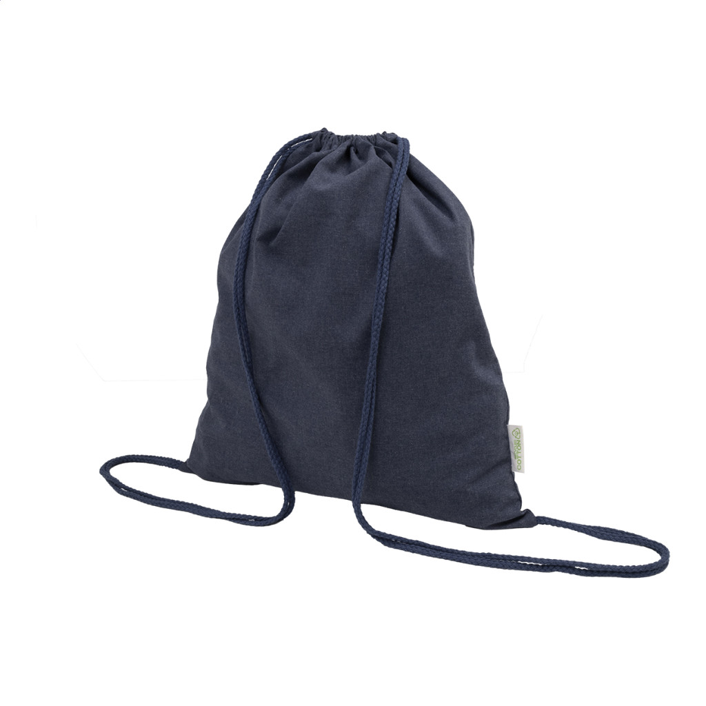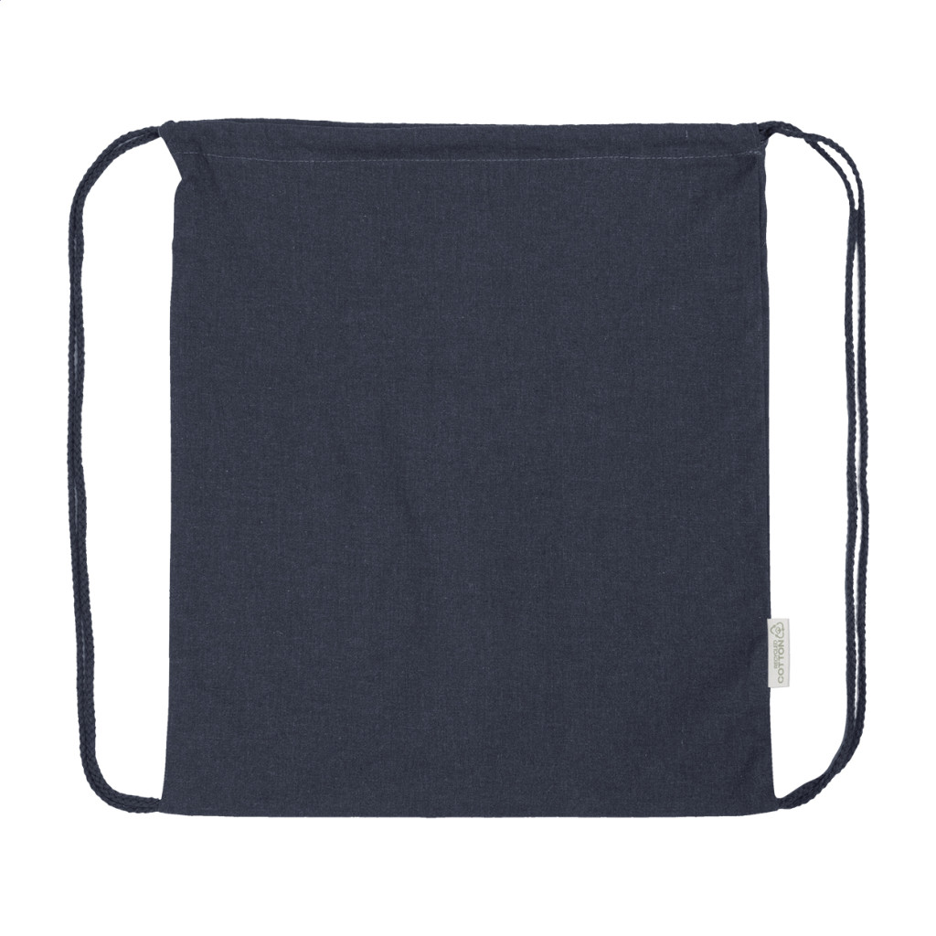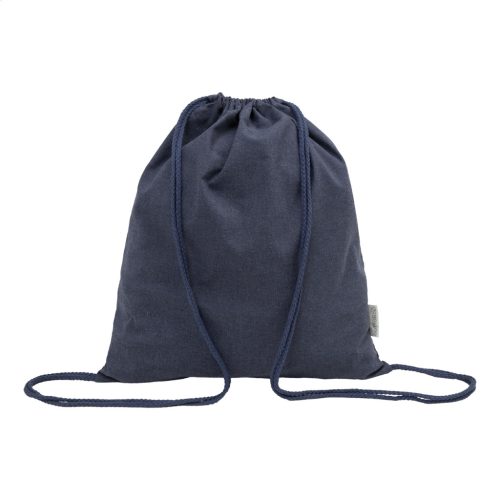 70% újrahasznosított pamutból és 30% RPET poliészterből készült hátizsák, 140 g/m². Megkülönböztető újrahasznosított pamut címkével.