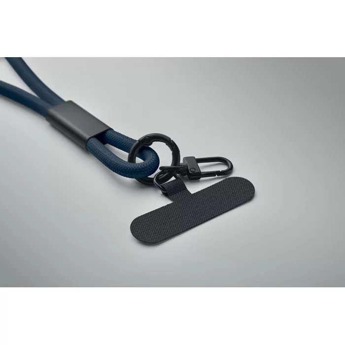 Zsinóros, 60 W-os, C-típusról C-típusúra töltő- és adatátviteli kábel RPET-ből, telefon- és karabíneres kulcstartó karikával.
